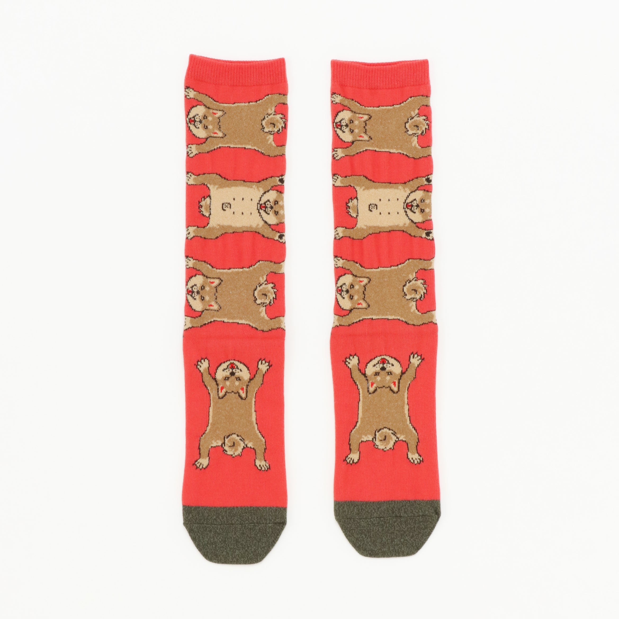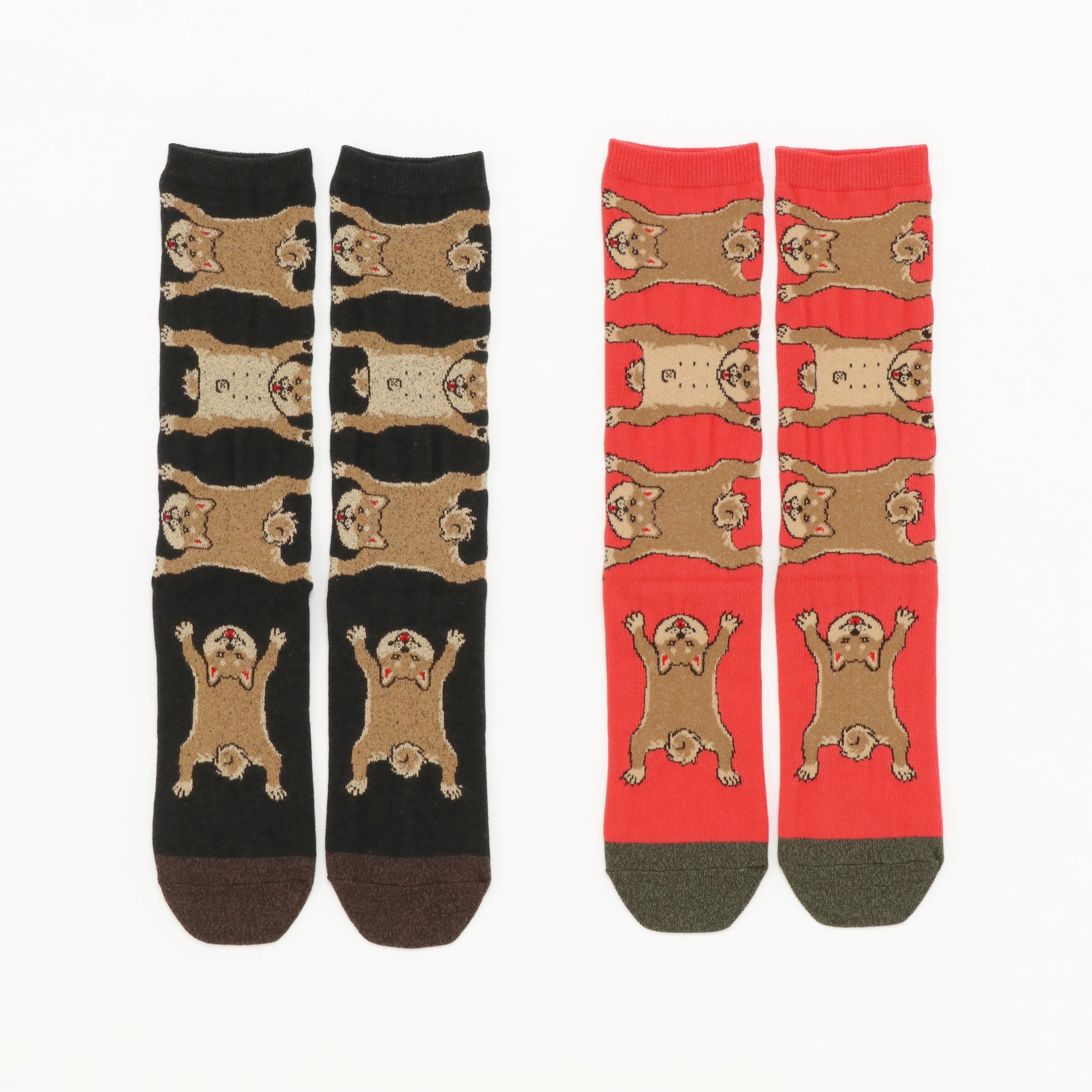 日々コーヒーショップに訪れる飼い主さんと犬たちとの温かな時間。そんな日常の一コマを切り取り、靴下に落とし込みました。